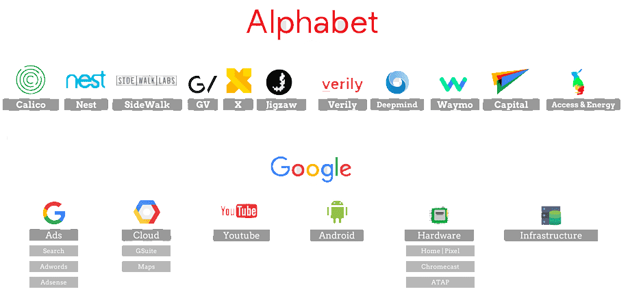 구글은 1998년 래리 페이지와 세르게이 브린이 설립한 검색 엔진 회사로 출발했다. 이후 검색 광고, 인공지능, 클라우드, 컴퓨팅, 스마트폰, 자율주행차 등 다양한 분야로 사업을 확장했다. 그러나 구글이라는 이름 아래 너무 많은 사업이